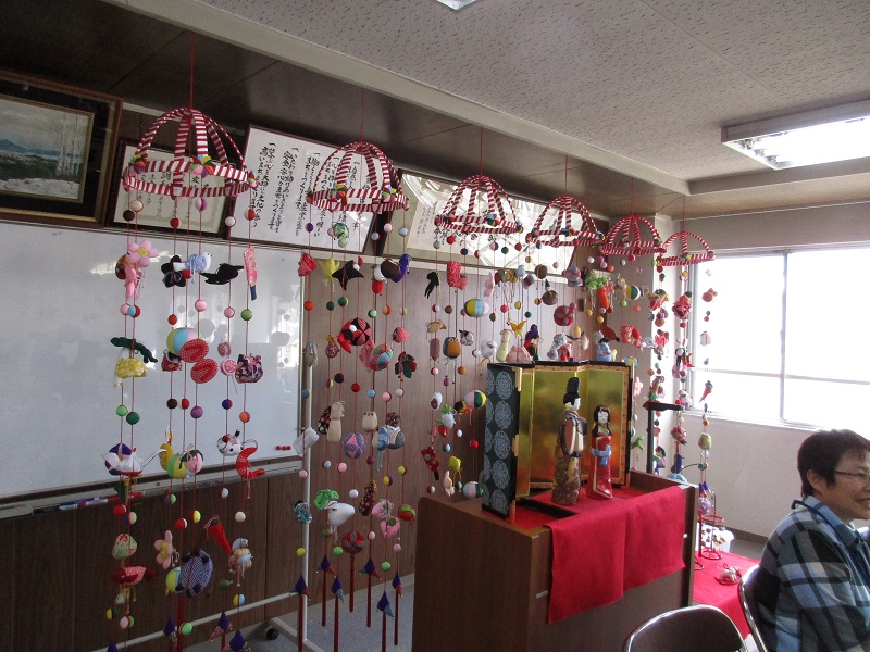 華やかな吊るし雛や木目込み立ち雛を飾り、綺麗なお雛様を見ながら全員で「うれしいひなまつり」を唄いました。