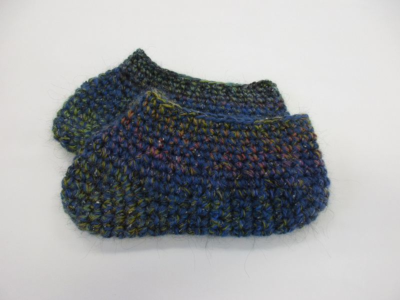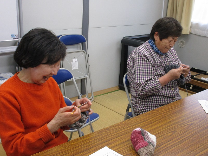 3色の毛糸を合わせて自分色の毛糸を作り、編み方が始まりました。赤穂の話、気仙沼の話など話かだりをしながら和気藹々と手を動かし、あっと言う間に、暖か~いホームカバーが完成! 終始和やかな雰囲気の編み物教室となりました。