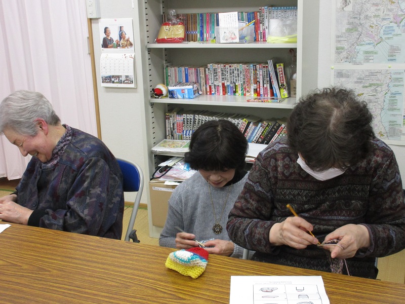 気仙沼田中公園住宅にて、兵庫県赤穂市のボランティアの方からホームカバー編みを教えて頂きました。