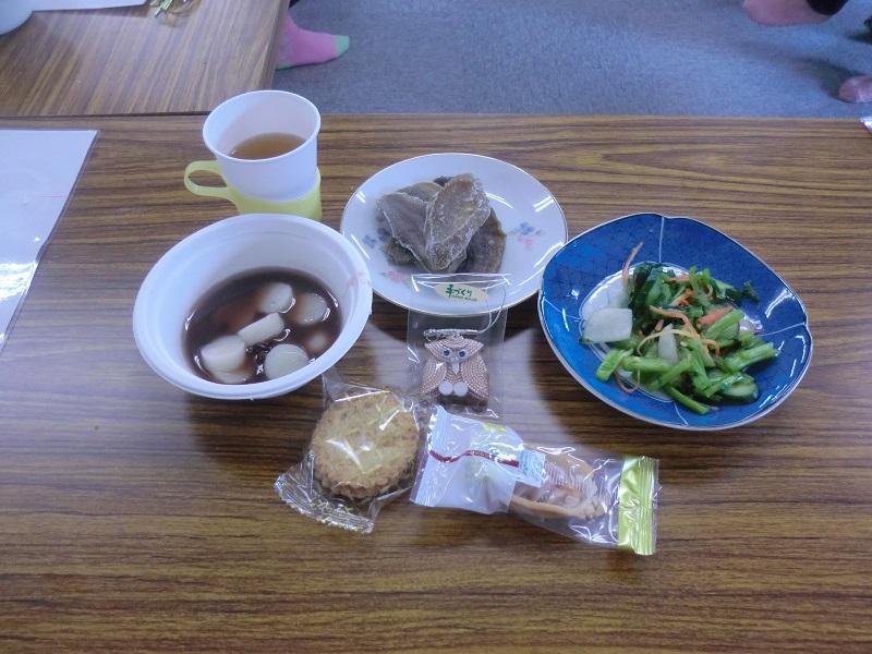 その後は、高齢サロンの役員さんが作ったお汁粉や漬物でお茶会をしました。皆さん出来上がったふくろうストラップを見せ合い、楽しい雰囲気のサロンとなりました。