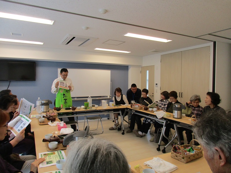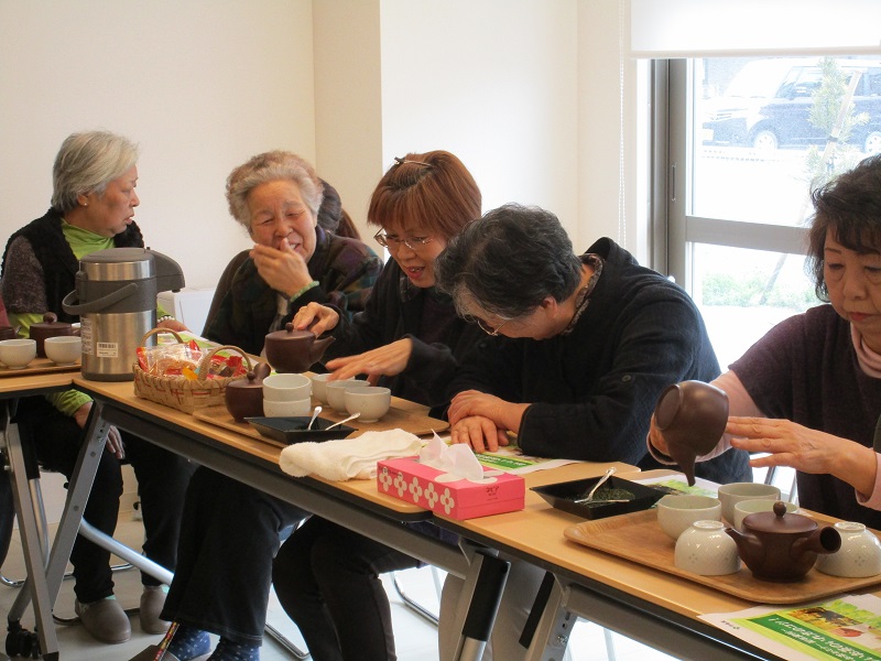 四反田住宅では初めての交流会ということもあり、皆さんちょっと照れながら自己紹介を交わした後、3人1組になり伊藤園のお茶マイスターの方から『おいしいお茶の淹れ方』を学びました。普段の淹れ方と教えられた淹れ方を比較したり、水出しのお茶にチャレンジしました。それぞれお茶の好みの話で盛り上がったり、「淹れ方も上手だけんと、みんなで飲むと美味しいね。」との声があがったり、賑やかで笑顔いっぱいのお茶会になりました。