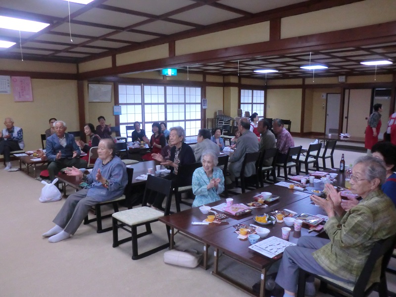 時間前から楽しみにしている住民さんが集まり、テーブルの上にはお弁当やボランティアさんが用意した心づくしのお菓子、漬物、お吸物などが並びました。