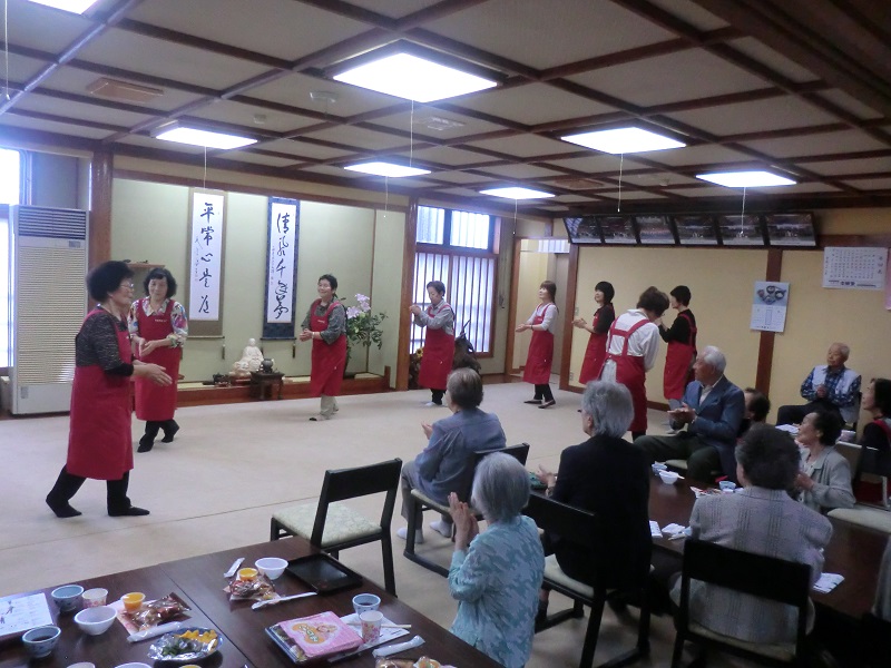 食事の後は住民さんによるのど自慢や、転倒予防を目的として気仙沼市が市民の皆さんなどと一緒に作った「海潮音体操」を行いました。この体操で使われている曲、「海潮音」は気仙沼の祭囃子で、今回の会場となった青龍寺の住職さんが作曲されました。