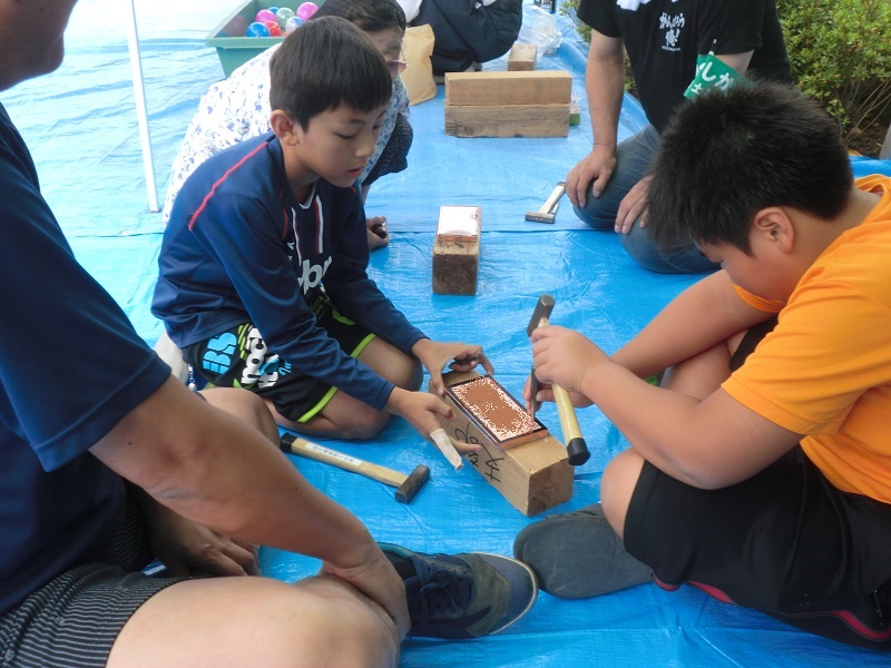 会場にはわたあめやポップコーンといった定番の屋台が並び、どのコーナーにも行列が! 体験教室も開かれ、参加した子供達は銅板で器用に表札を作っていました。また、餅まきも行われ、沢山のお餅がまかれるたびに歓声が上がり、この日一番の盛り上がりとなりました。