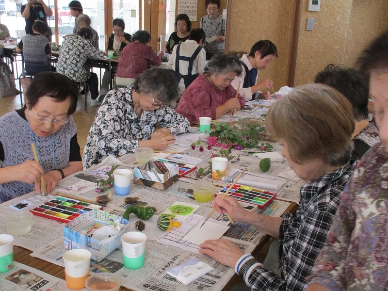 教室では季節の草花や野菜など思い思いの画材を選び、隣や向かいの席の方の作品を眺めたり、会話をしながら世界にひとつだけの作品を描きました。