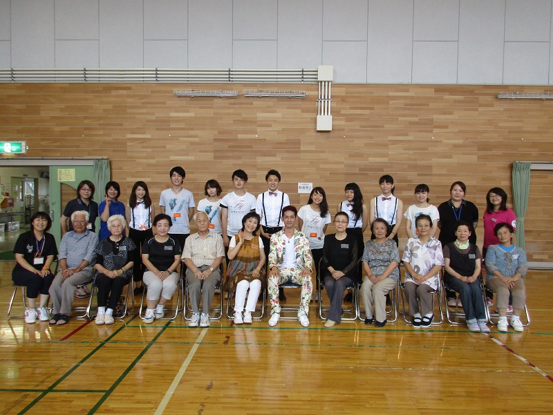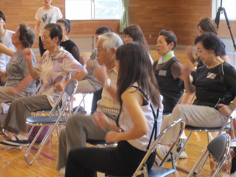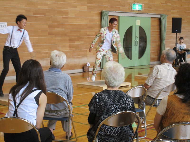 松岩公民館にて、タップダンスカンパニーフライハイトさんによるタップダンスのミニ公演と椅子に座ってのタップダンス体験会を開催しました。一つ一つの動作と一緒にタップダンスの由来を聞いたり、チェアタップダンスは冷え性やむくみを改善する効果があり転倒予防にも繋がるということを教わりました。椅子に座りながらの簡単な動作だった事もあり、皆で楽しく一生懸命にステップに挑戦し、会場に一体感が生まれていました。