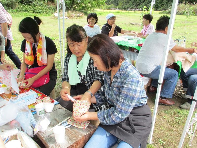緑いっぱいの自然の中、アロマオイルを使ったマッサージを受けて参加者は身も心もリラックス。ハンドクラフトではバスソルトとシューズキーパー作りを体験し、参加された皆さんはコツを教わりながら器用に手を動かしていました。