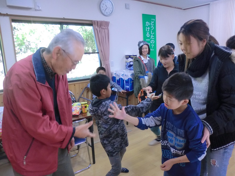 幼児から高齢の方までが集い、地元の新米を使ってお母さんたちがおにぎりなどを作り、外ではお父さんたちが火を熾しチームワークもバッチリです!!昼食までの間は気仙沼市の保健師を講師に脳トレ手遊びやインフルエンザ予防を学び、その後は社協職員と一緒に「いけいけ!!お茶っこ体操」等で軽い運動をしました。