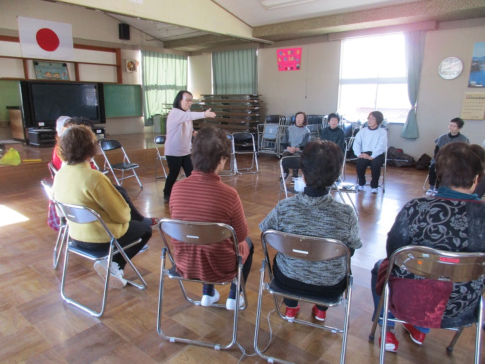 唐桑鮪立老人憩いの家で認知症サポーター養成講座(北部包括)が開催されました。唐桑鮪立地区はサロンが活発に行われている地域です。今回の講座には17名の参加がありました。参加者は元気いっぱいです。健康体操から始まり、寸劇を交えての講座では大変盛り上がり「わかりやすく受講してよかった」と感想を伺いました。