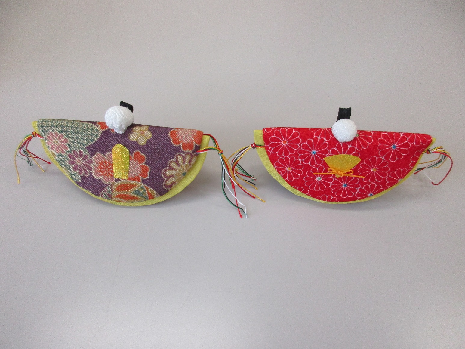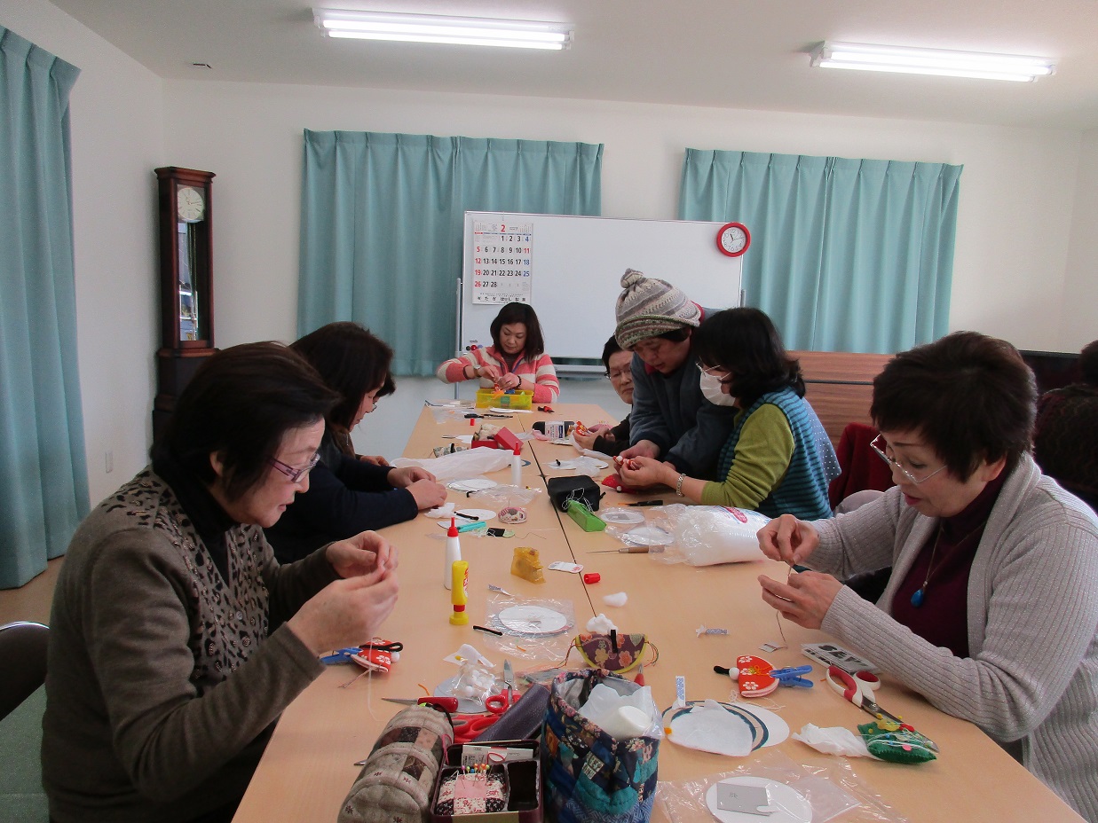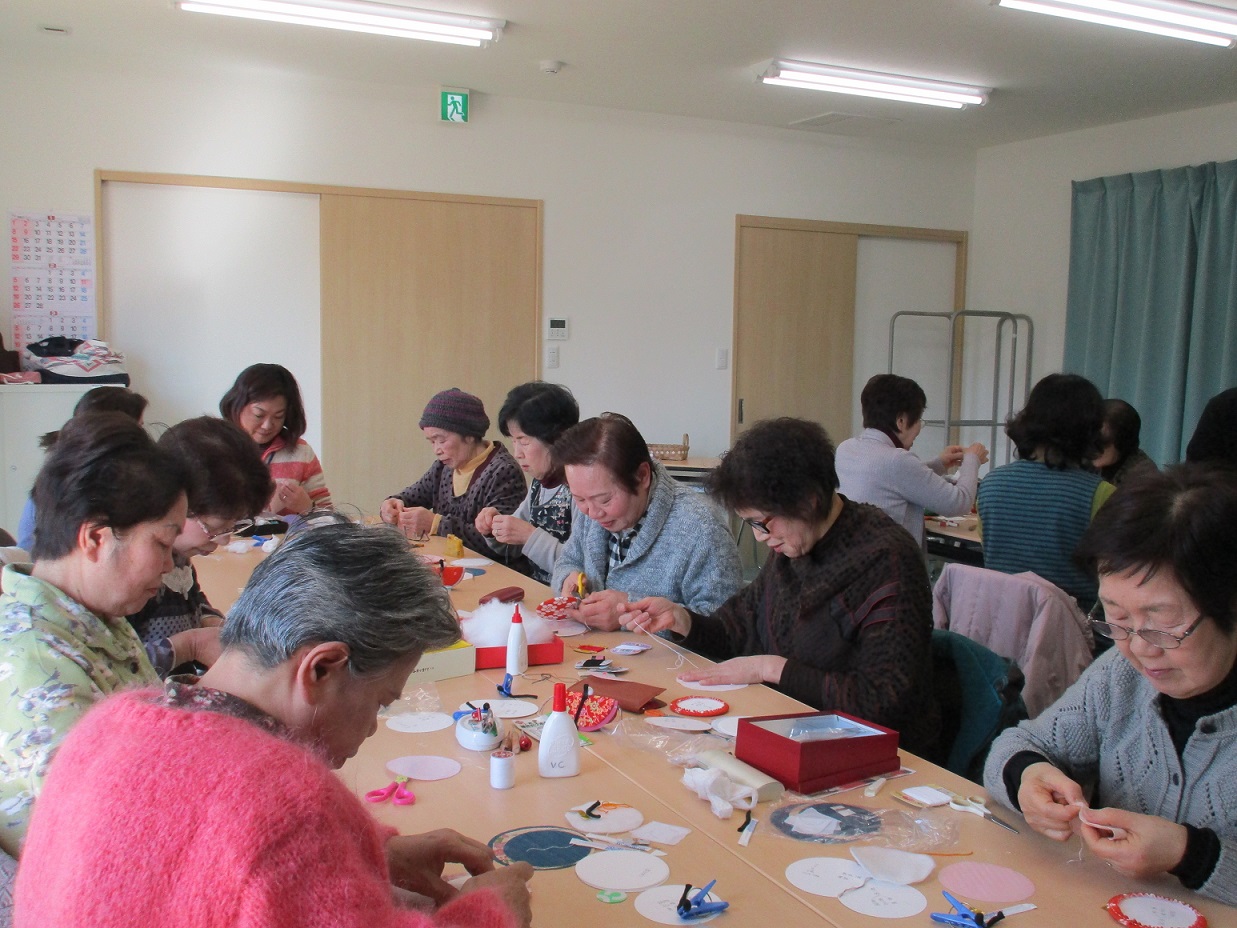桃の節句が近い事もあり、キットを利用し参加者全員で手のひらに乗せられる位の雛人形つくりに皆さん無中になりましたが、人形が完成するに従い会話も増え、お互い見せ合いながら「雛人形」を机に並べ、お茶を頂きながら楽しそうに談笑していました。