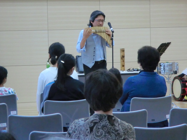 子供から高齢者まで幅広く49名の参加がありました。独学で製作されたパンフルート(竹笛)、漫談をはさみながらの演奏に「すご~い」との声や大笑いの連続で口角があがりっぱなし~後半は和太鼓と笛の同時演奏、皆さん満足された様子でした。