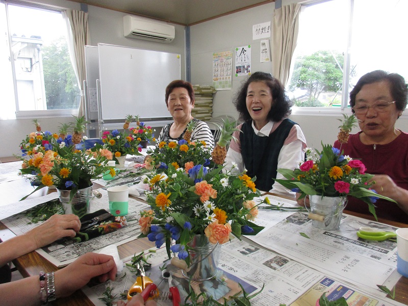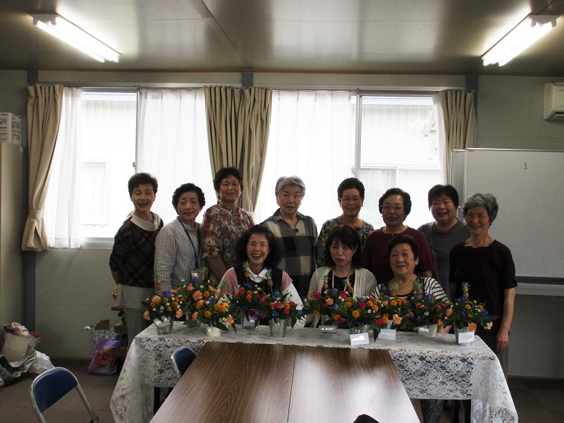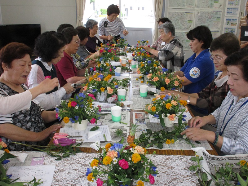 松岩中学校住宅集会場にて、フラワーアレンジメント教室が開催され10名の方が参加されました。