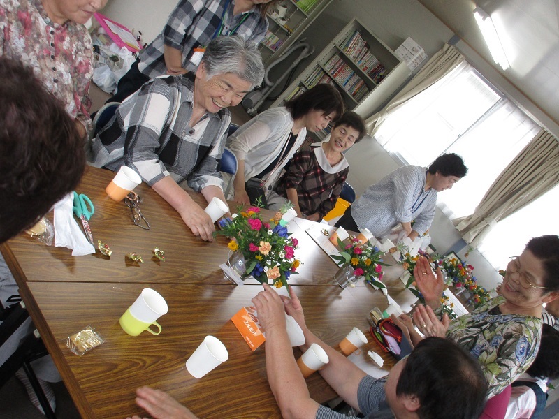 今回は、仮設住宅の方々と地域の方々が、共にラウンド(※)というアレンジ方法を学び実践しました。